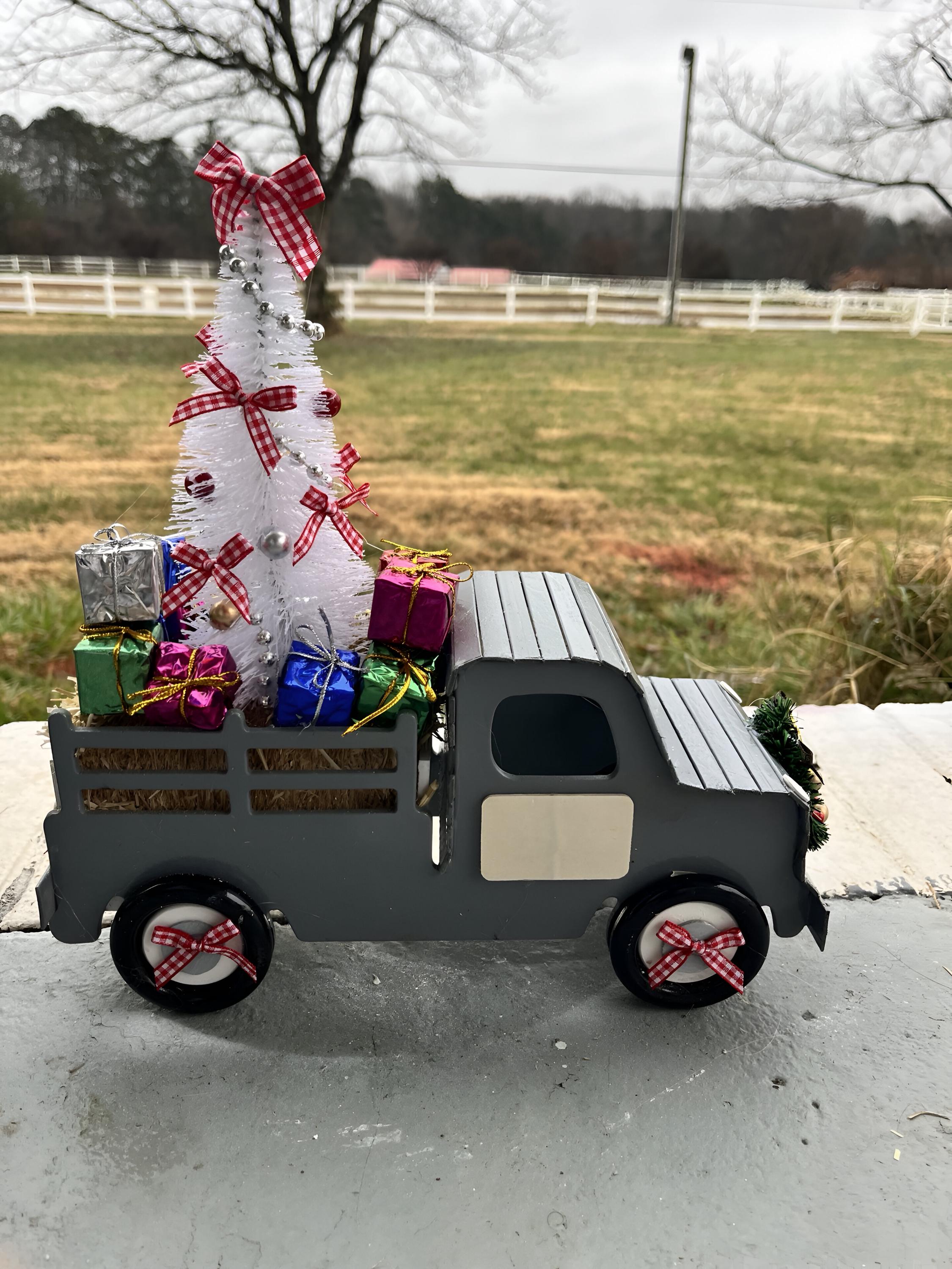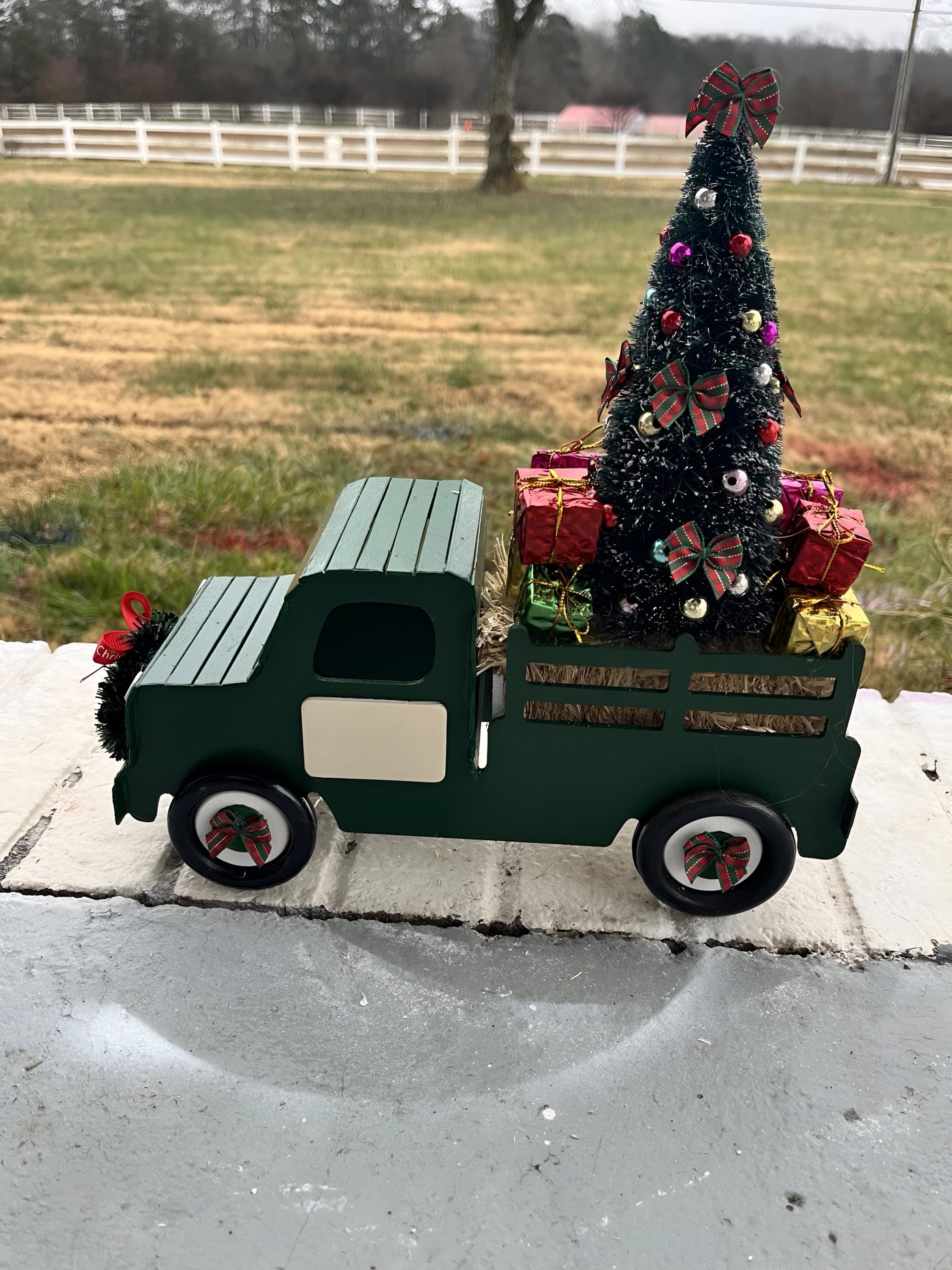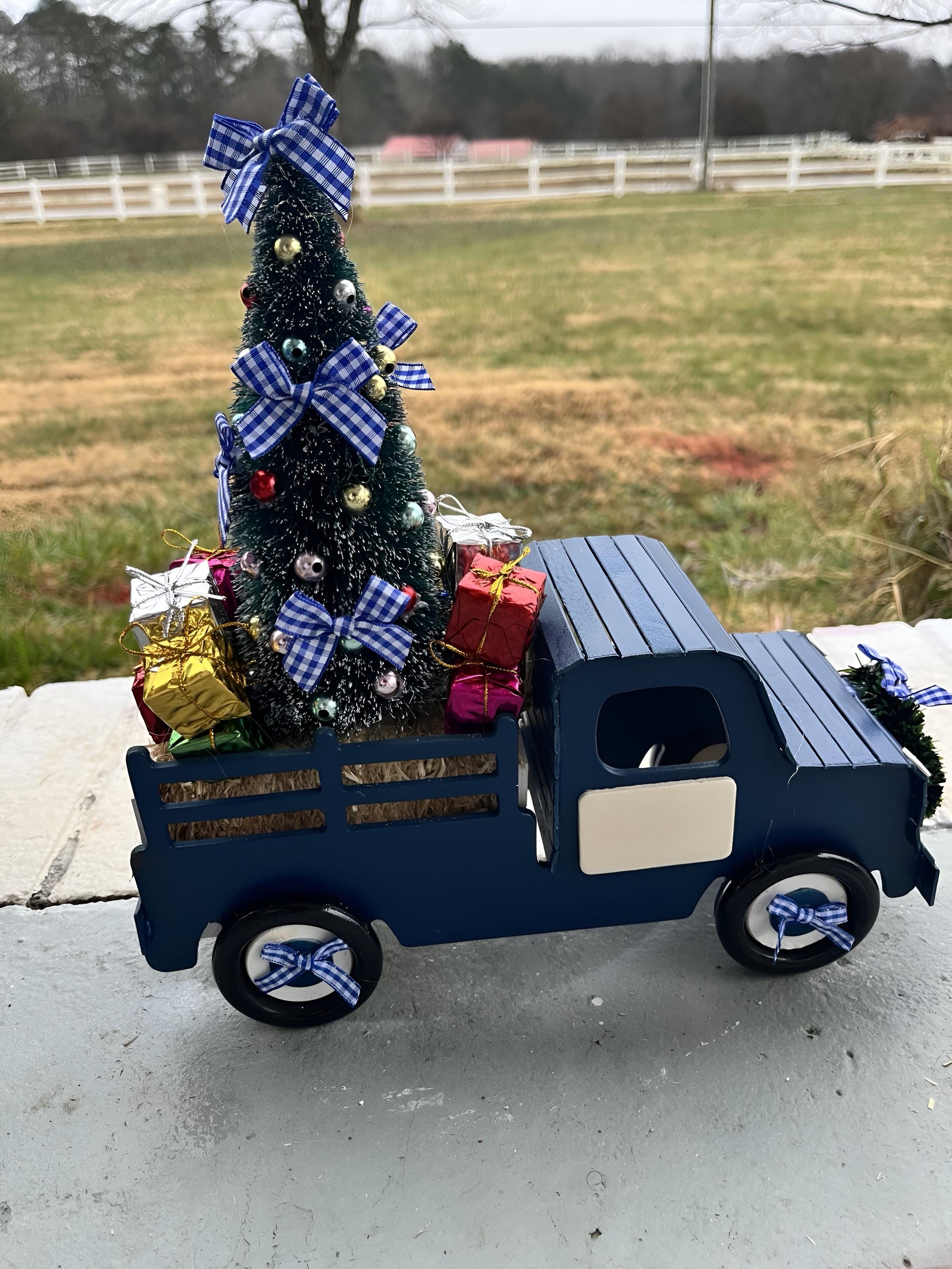 In the truck bed, youβll find a mini Christmas tree and tiny wrapped gifts resting on a real straw bale, complete with a plaid bow and wreath accent. Perfect for mantels, tabletops, or holiday displays, these trucks add warmth and farmhouse cheer anywhere you place them. Can be custom made with business Logo, etc