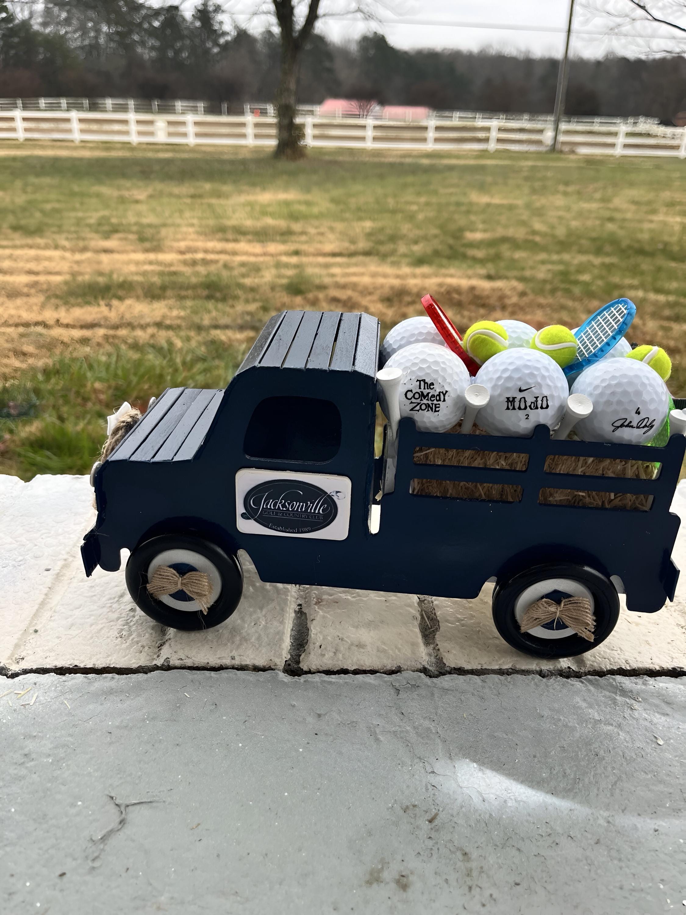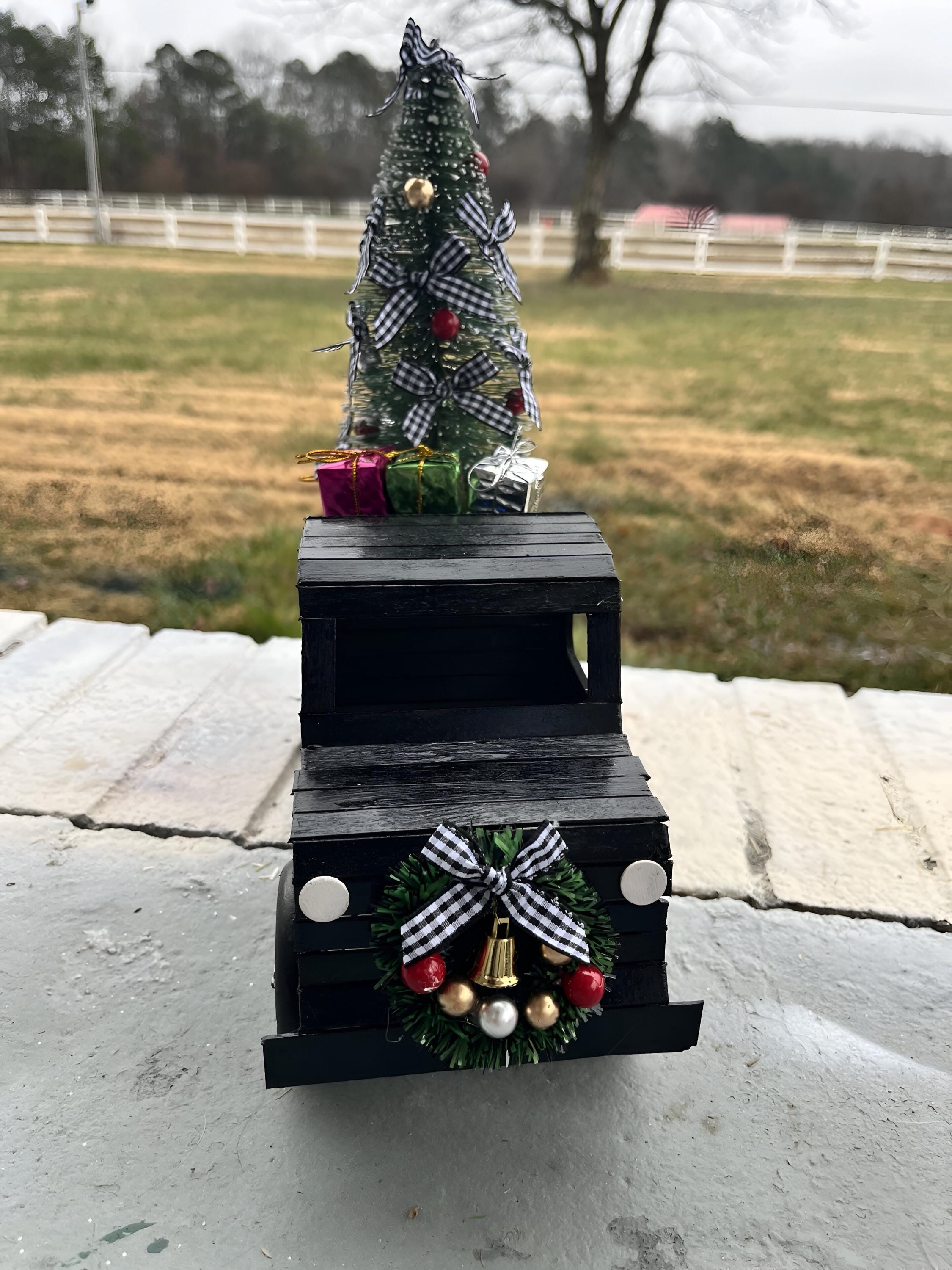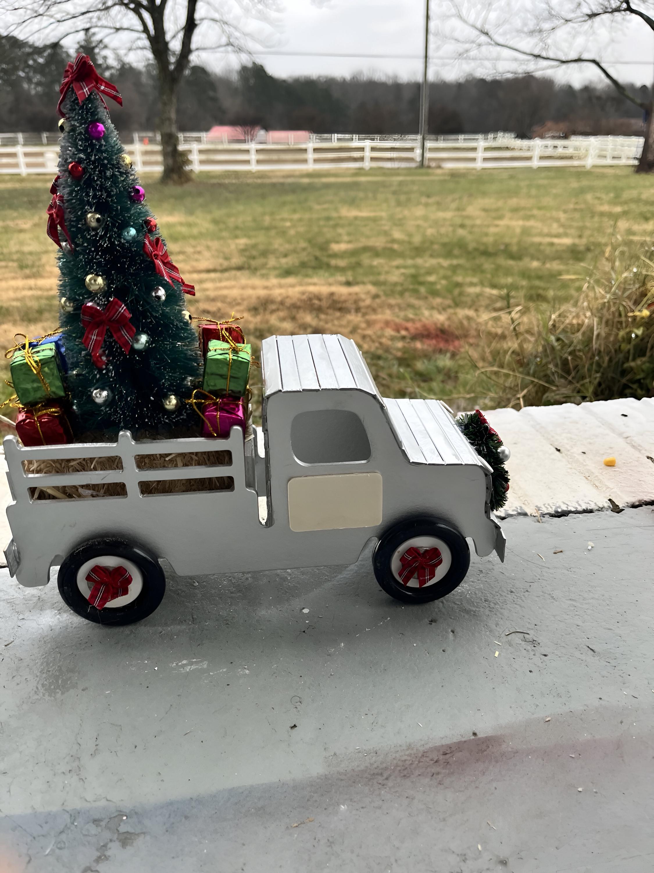 In the truck bed, youβll find a mini Christmas tree and tiny wrapped gifts resting on a real straw bale, complete with a plaid bow and wreath accent. Perfect for mantels, tabletops, or holiday displays, these trucks add warmth and farmhouse cheer anywhere you place them. Can be custom made with business Logo, etc