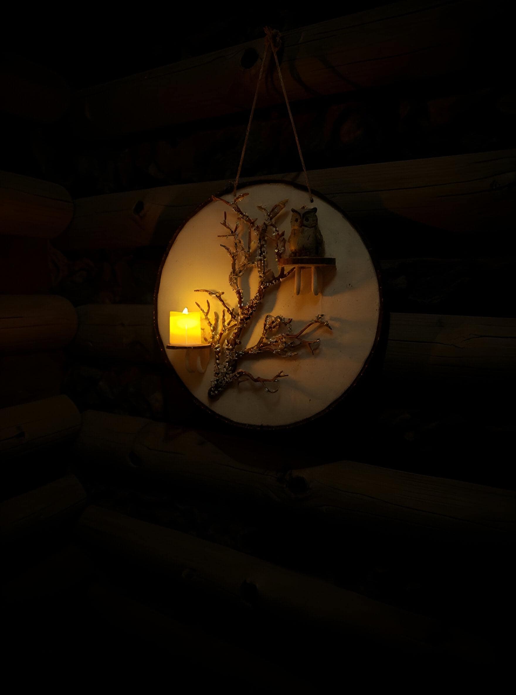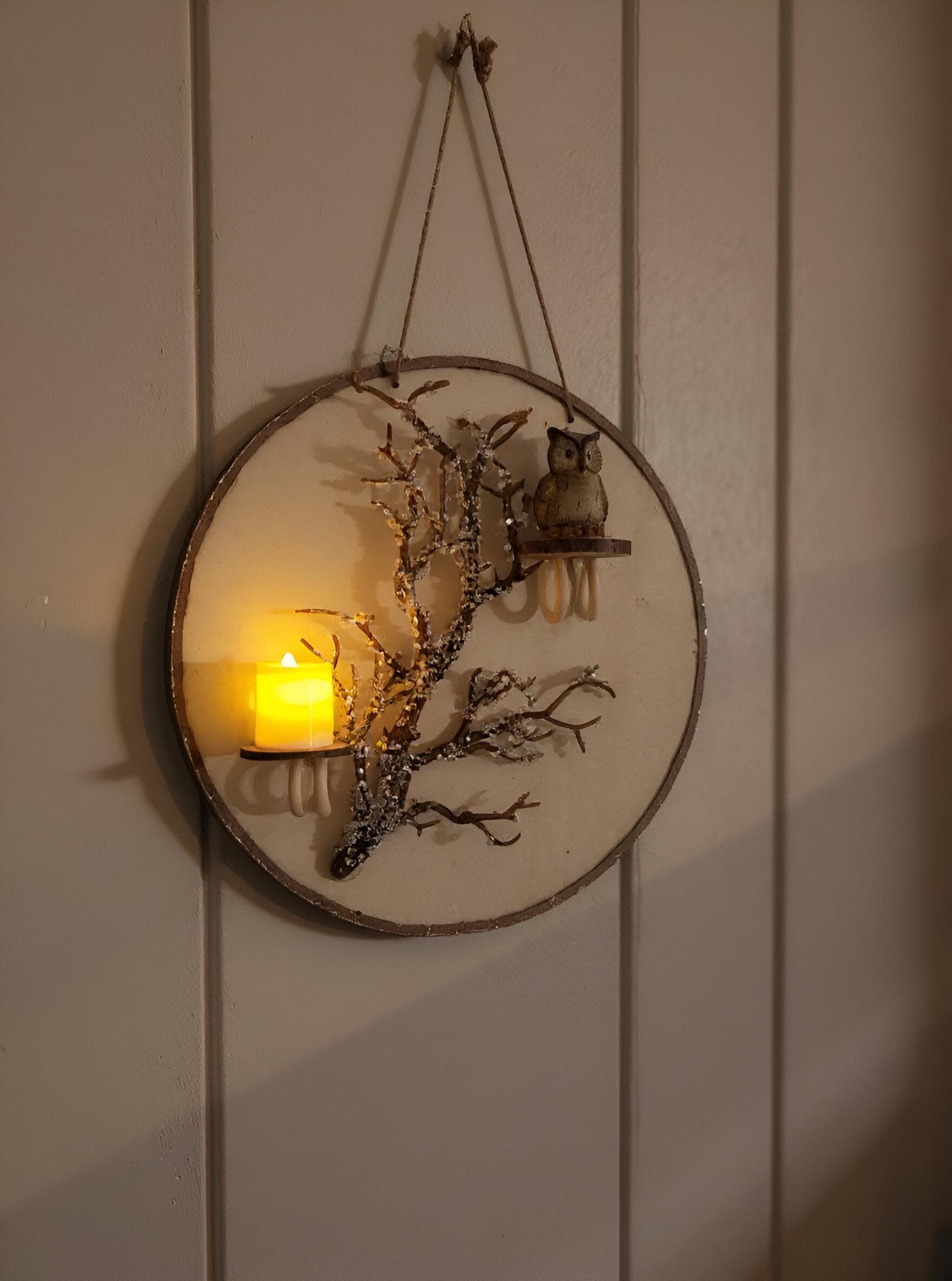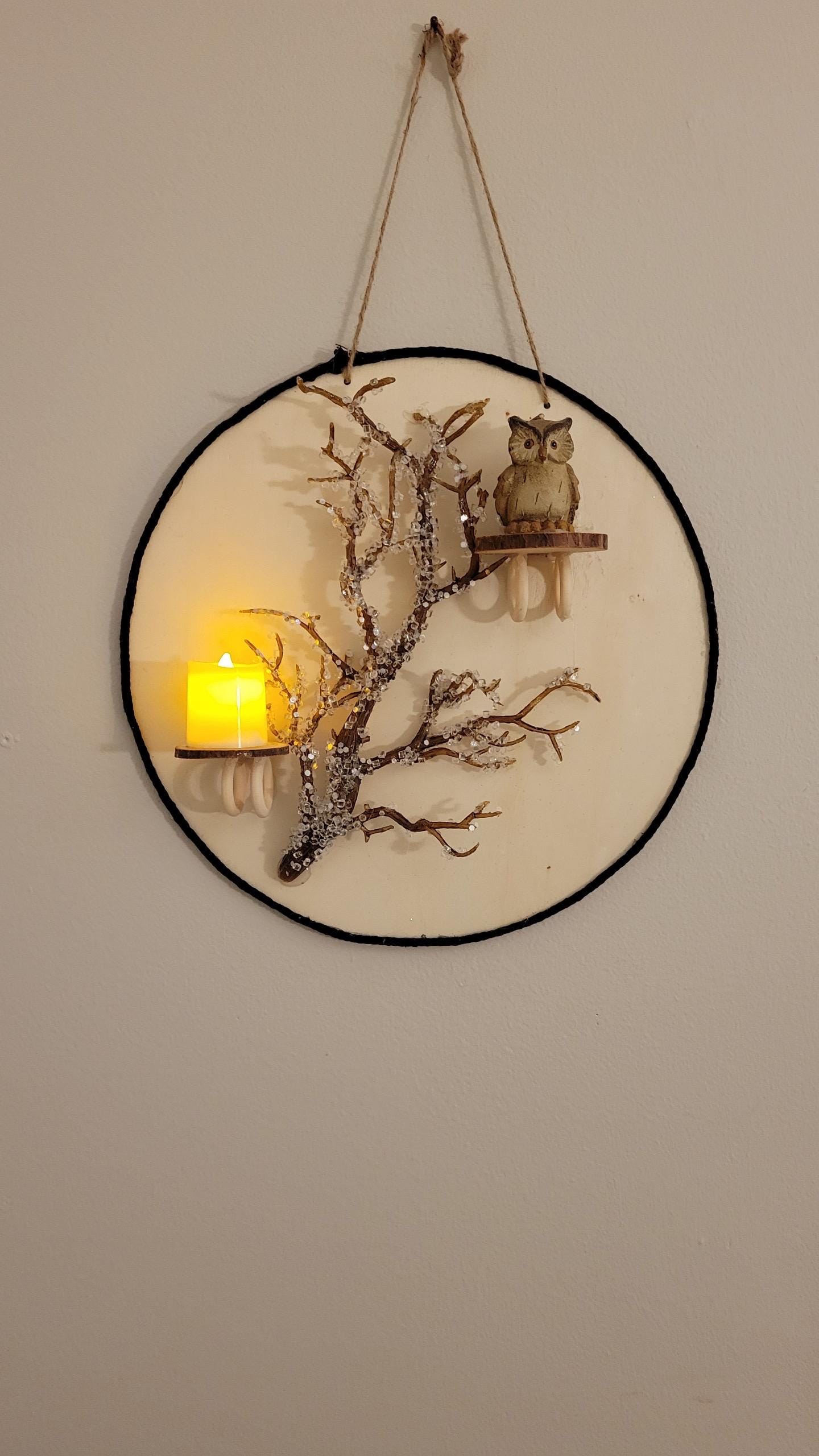 🕯️ Handmade Woodland Owl Wall Art with Candlelight – Rustic Winter Wall Hanging Décor
