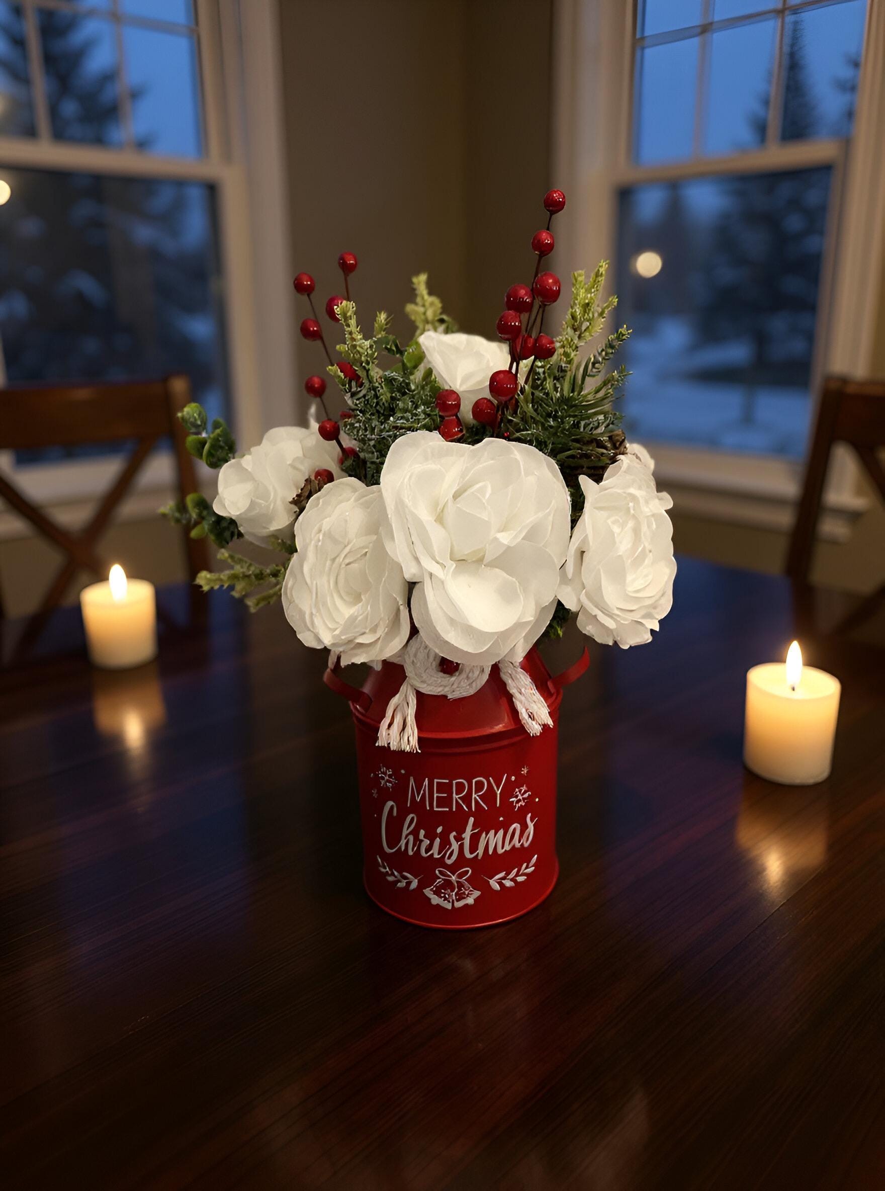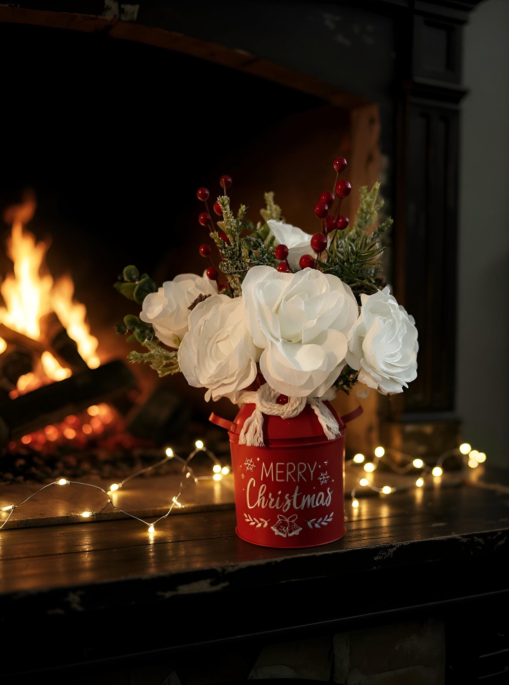Bring timeless Christmas charm into your home with this handcrafted holiday floral arrangement — beautifully set in a festive red metal pot that reads “Merry Christmas” in white script.