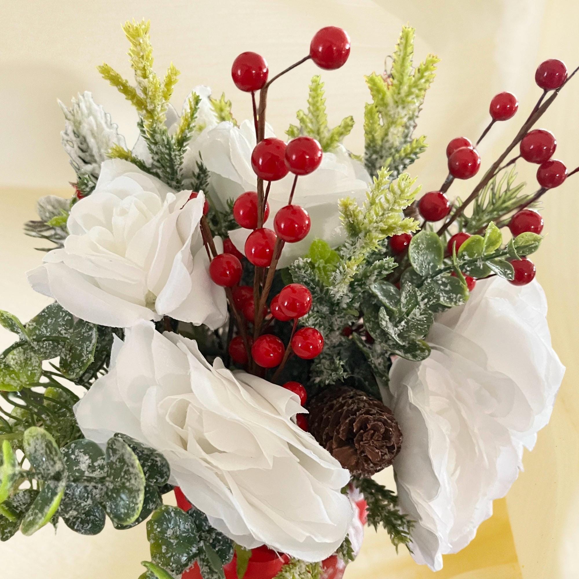 Christmas Floral Centerpiece – White Roses, Pinecones in Red Metal Pot