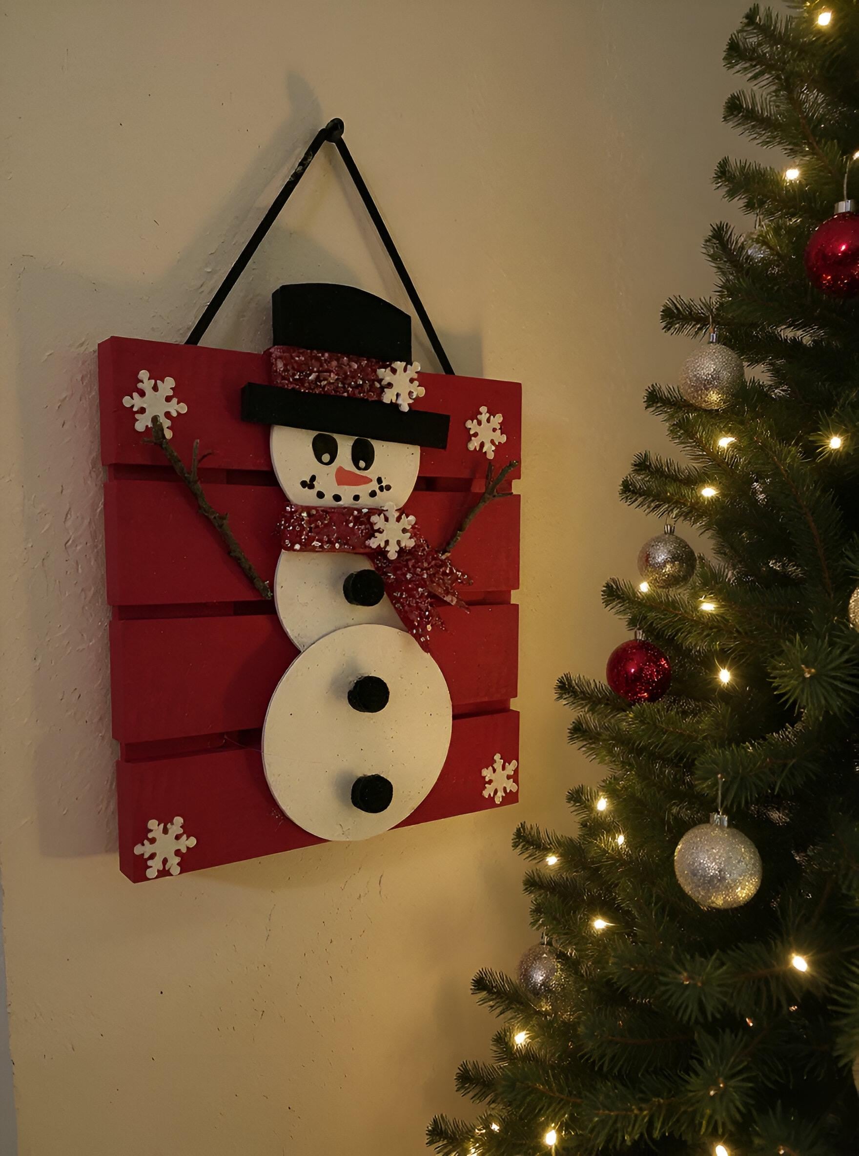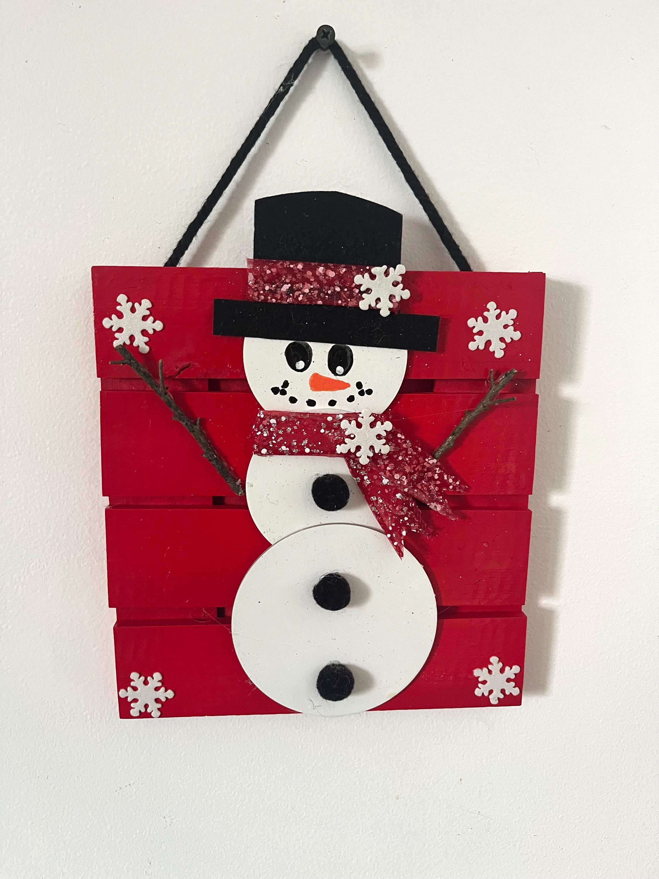 Add a touch of winter cheer to your home with this charming rustic snowman wall hanging! This handmade piece features a cheerful snowman with glittered accents, twig arms, and a red scarf, all set against a festive red wooden backdrop with snowflake details.
