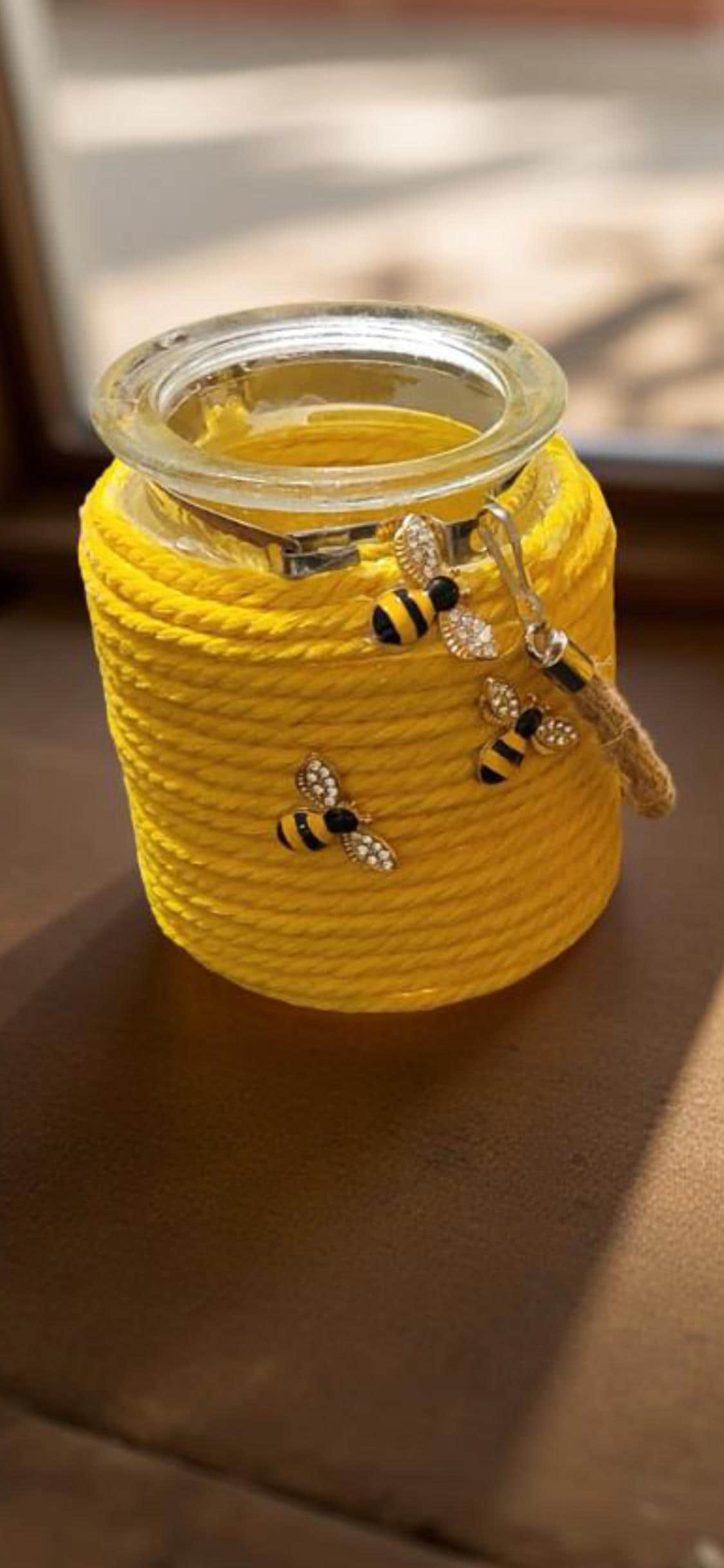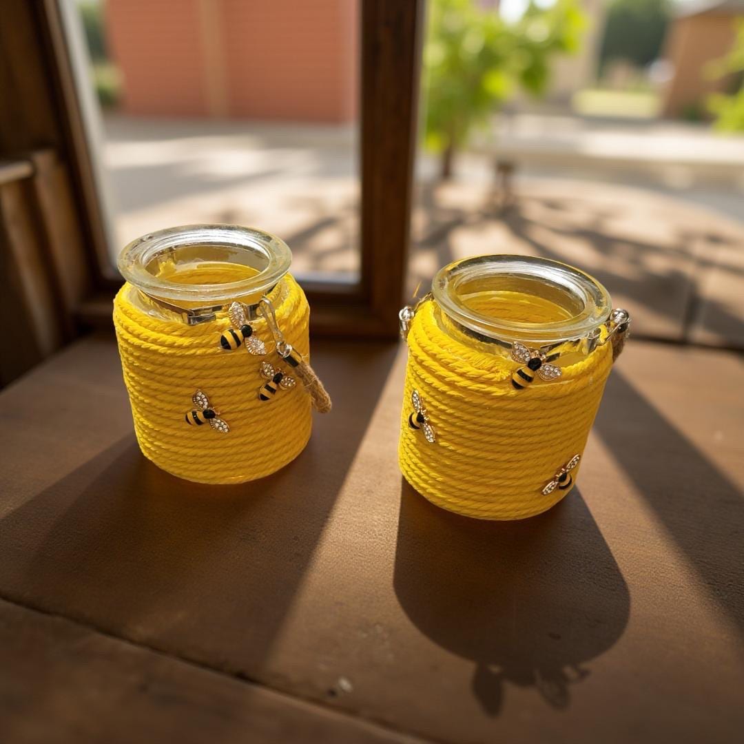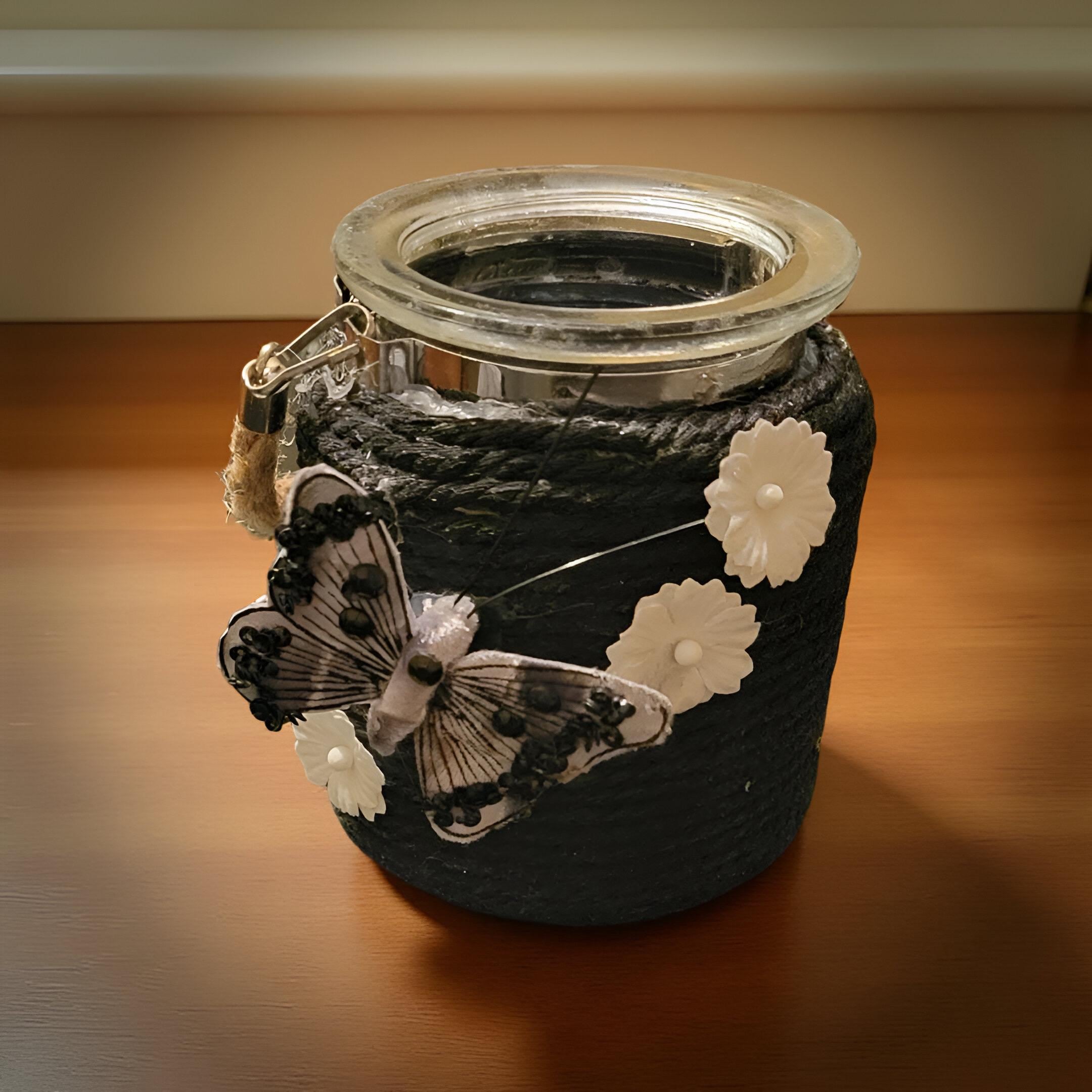 These unique handmade jars combine rustic charm with everyday functionality. Each jar is wrapped in sturdy rope and decorated with themed embellishments—choose from autumn leaves, bright yellow bee designs, or a black butterfly-and-flower style. Every jar includes a stretchy silicone lid, making it perfect for storing jelly, honey, syrup, sugar, spices, craft items, or other small household essentials.