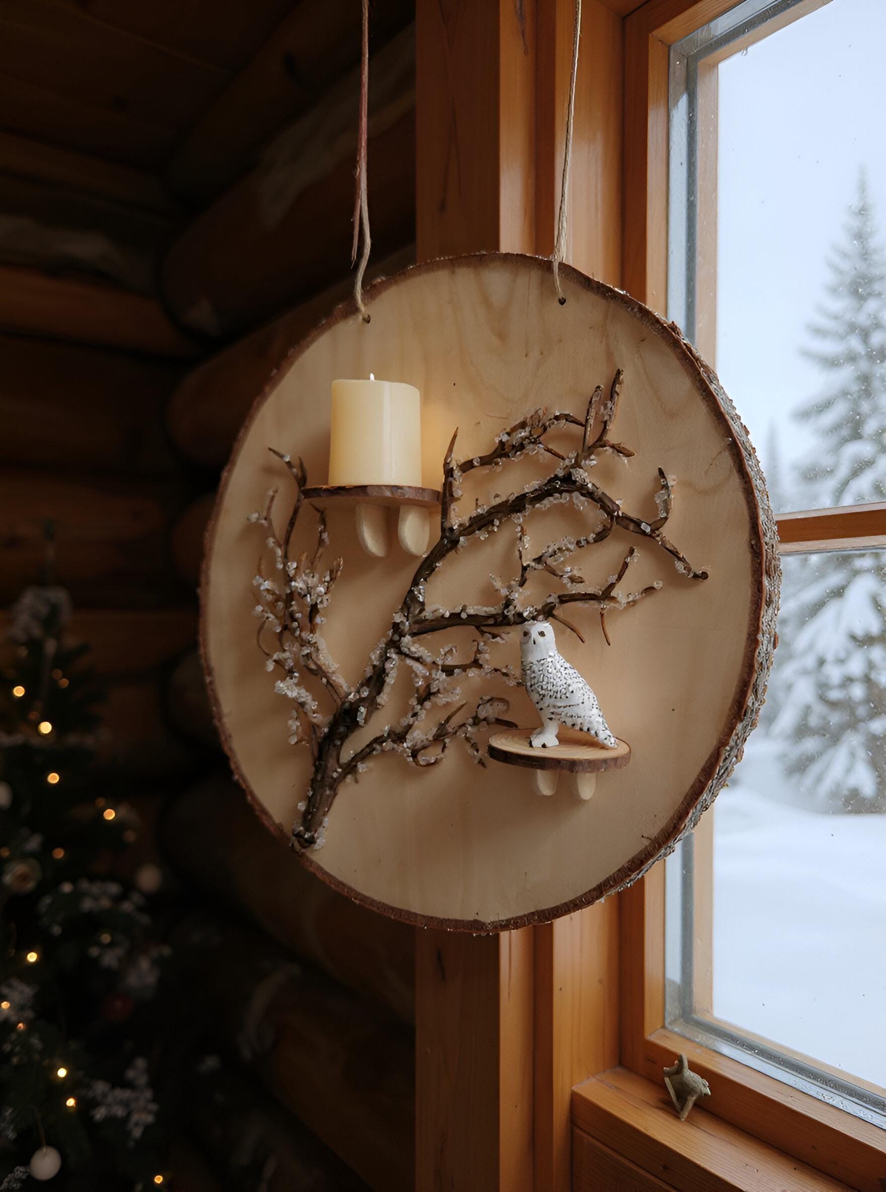 Crafted on a natural wood slice, the design includes a sparkling, snow-kissed tree branch and a small wooden candle shelf that holds a pillar or LED candle. The snowy owl adds a cozy woodland feel, creating a peaceful winter scene that hangs beautifully in any space.